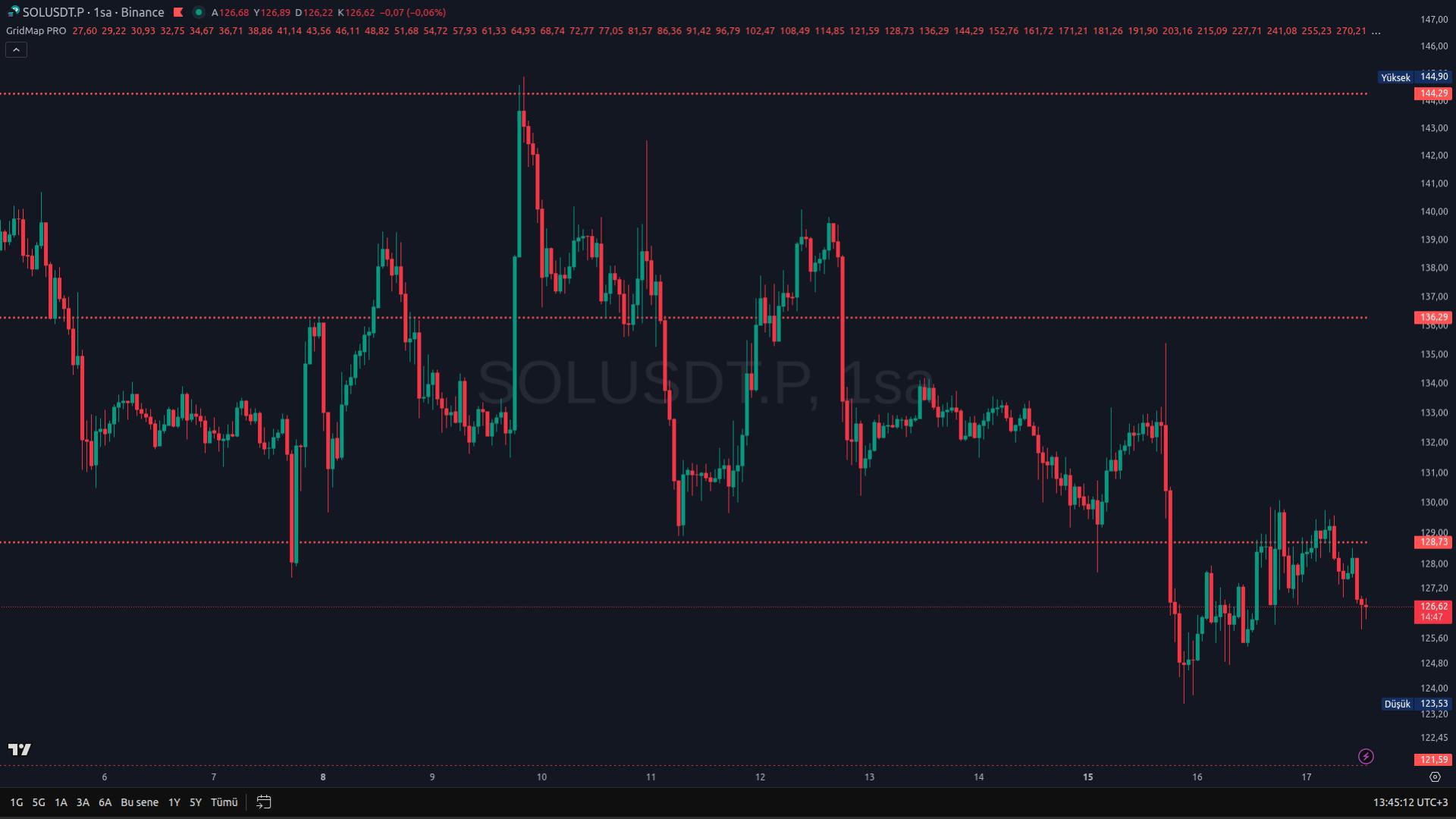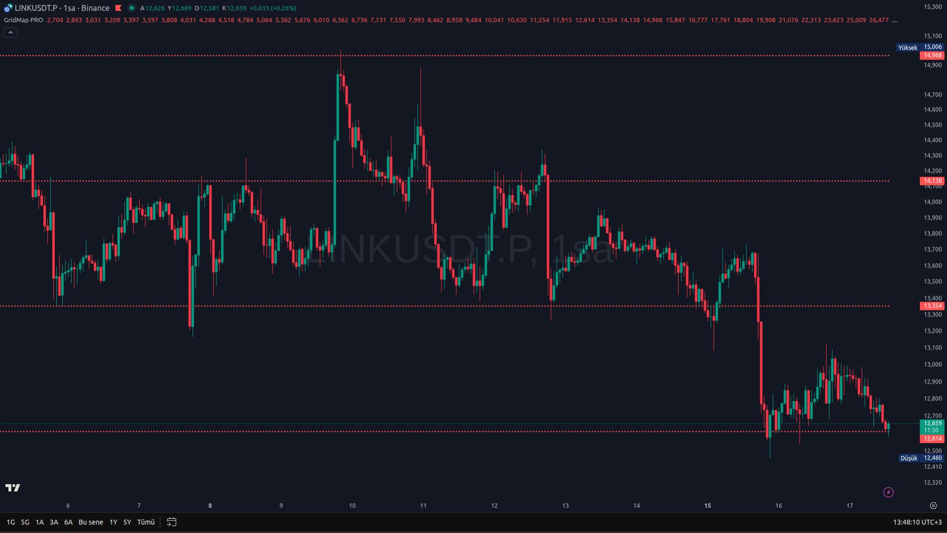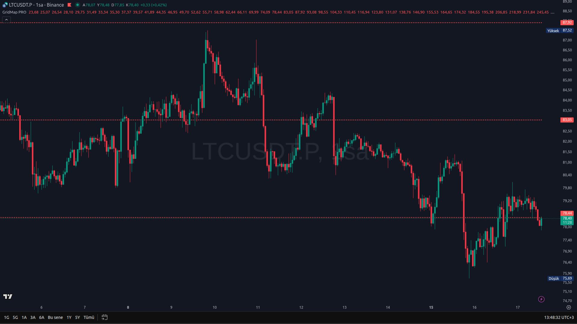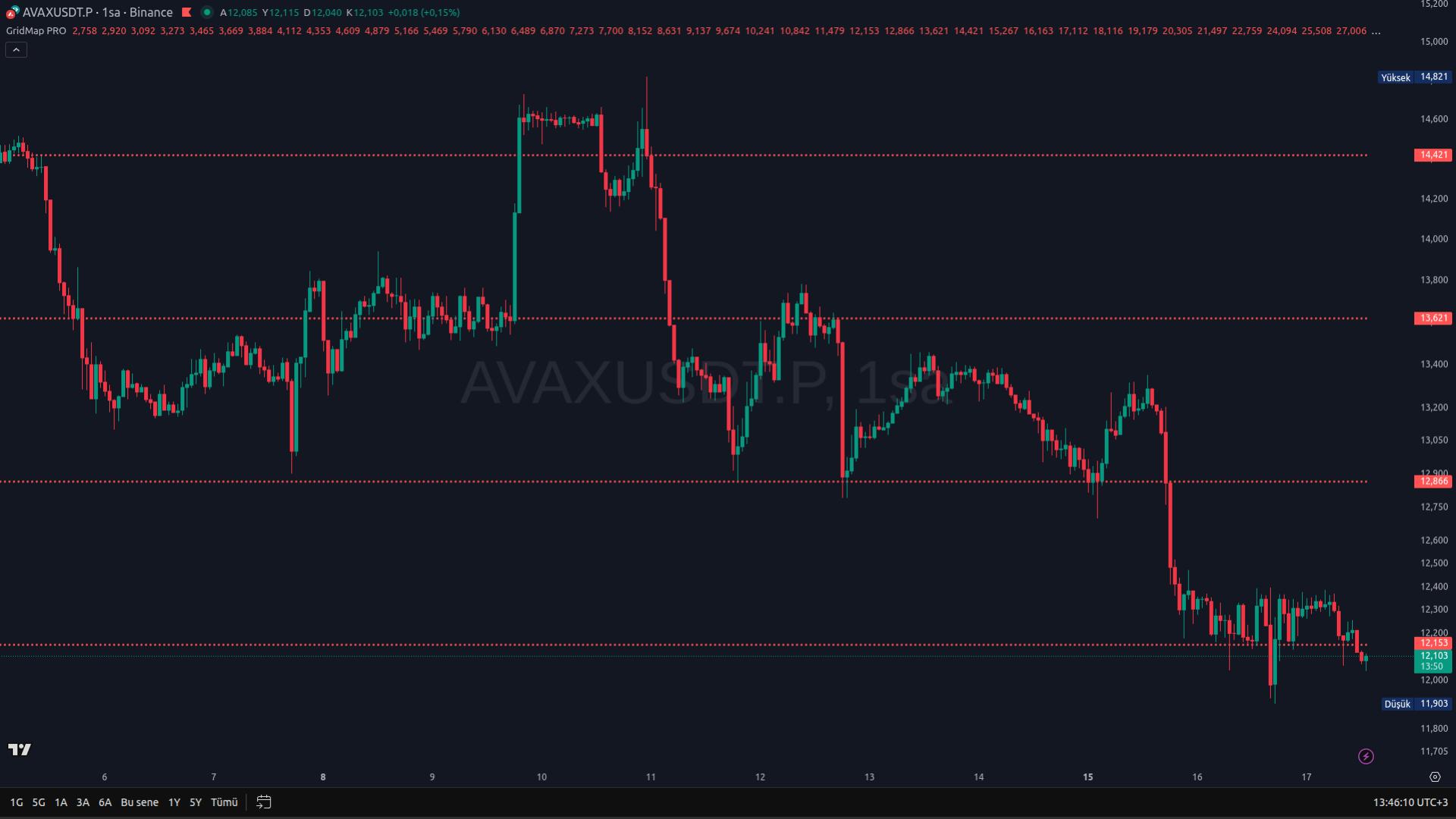 GridMap Pro, fiyat hareketlerinin çoğunlukla belirli yüzdesel aralıklar etrafında tekrarlandığı varsayımına dayanarak geliştirilmiş, istatistiksel olarak avantajlı seviyeleri önceden hesaplayan profesyonel bir destek–direnç indikatörüdür. Tüm seviyeler, tüm zamanların dip fiyatı referans alınarak matematiksel olarak üretilir; zaman diliminden bağımsızdır, değişmez ve repaint yapmaz.