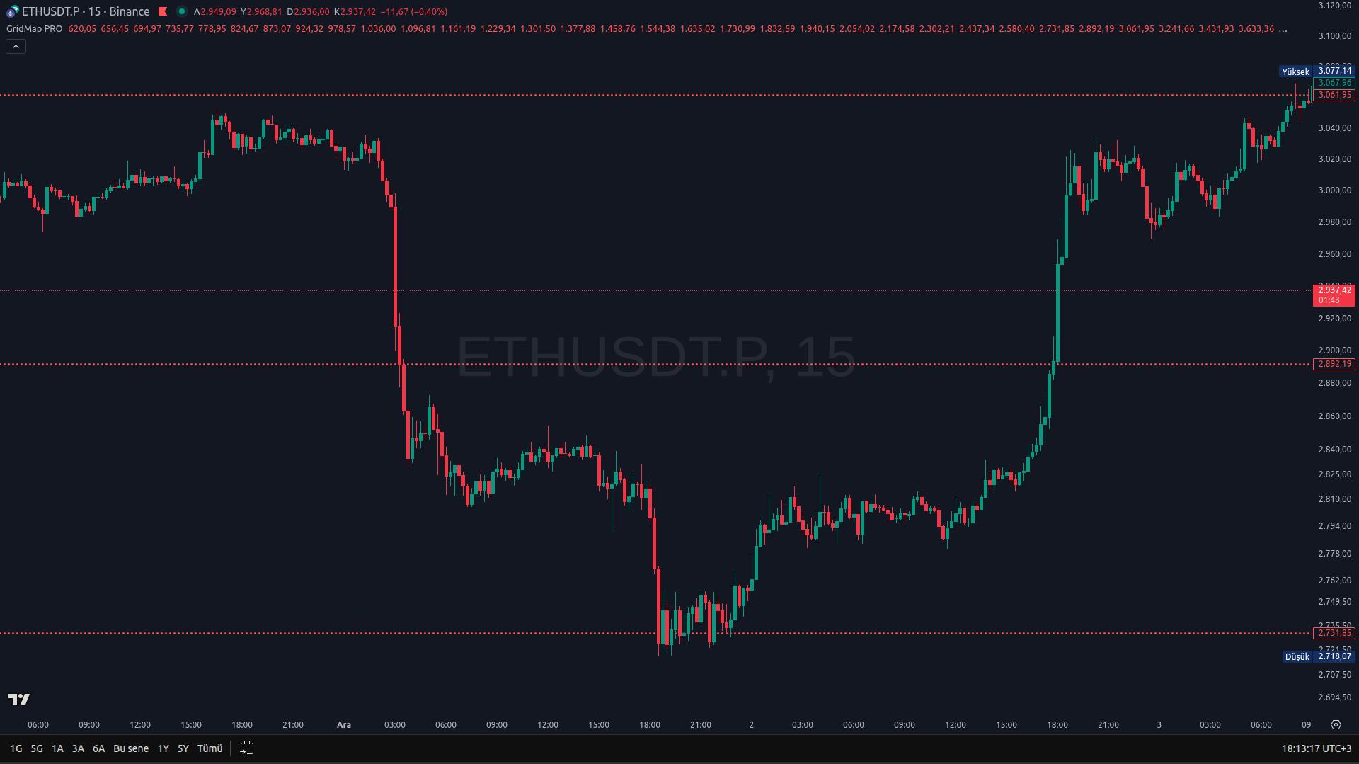 - Fiyat ilerledikçe eşit aralıklı short-term GridMap seviyeleri boyunca kademeli eklemeler planlanır.