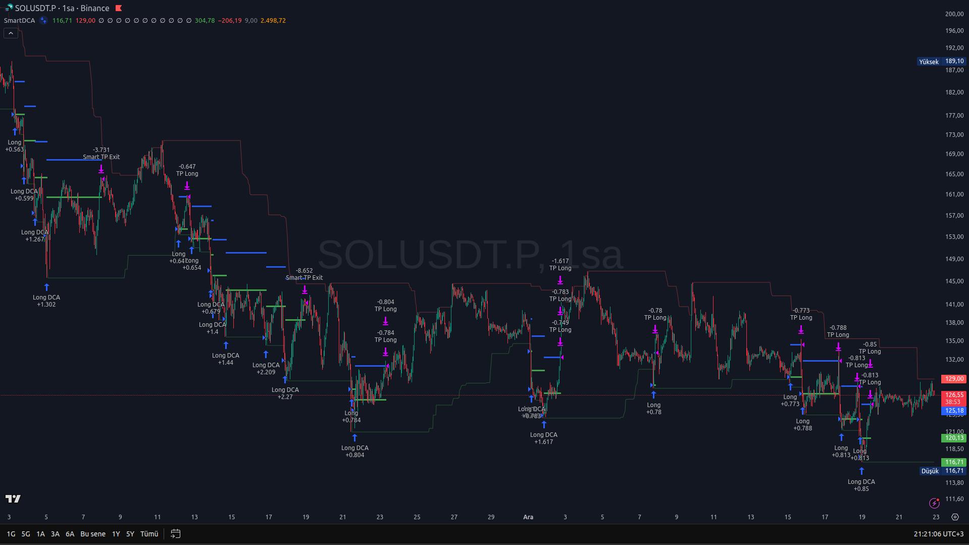 Strateji çalıştırıldıktan sonra SmartDCA, tüm işlem sürecini TradingView üzerinde görselleştirir. Kullanıcının görevi ise, bu plan doğrultusunda üretilen giriş ve dca sinyallerini borsa tarafında manuel olarak uygulamaktır.